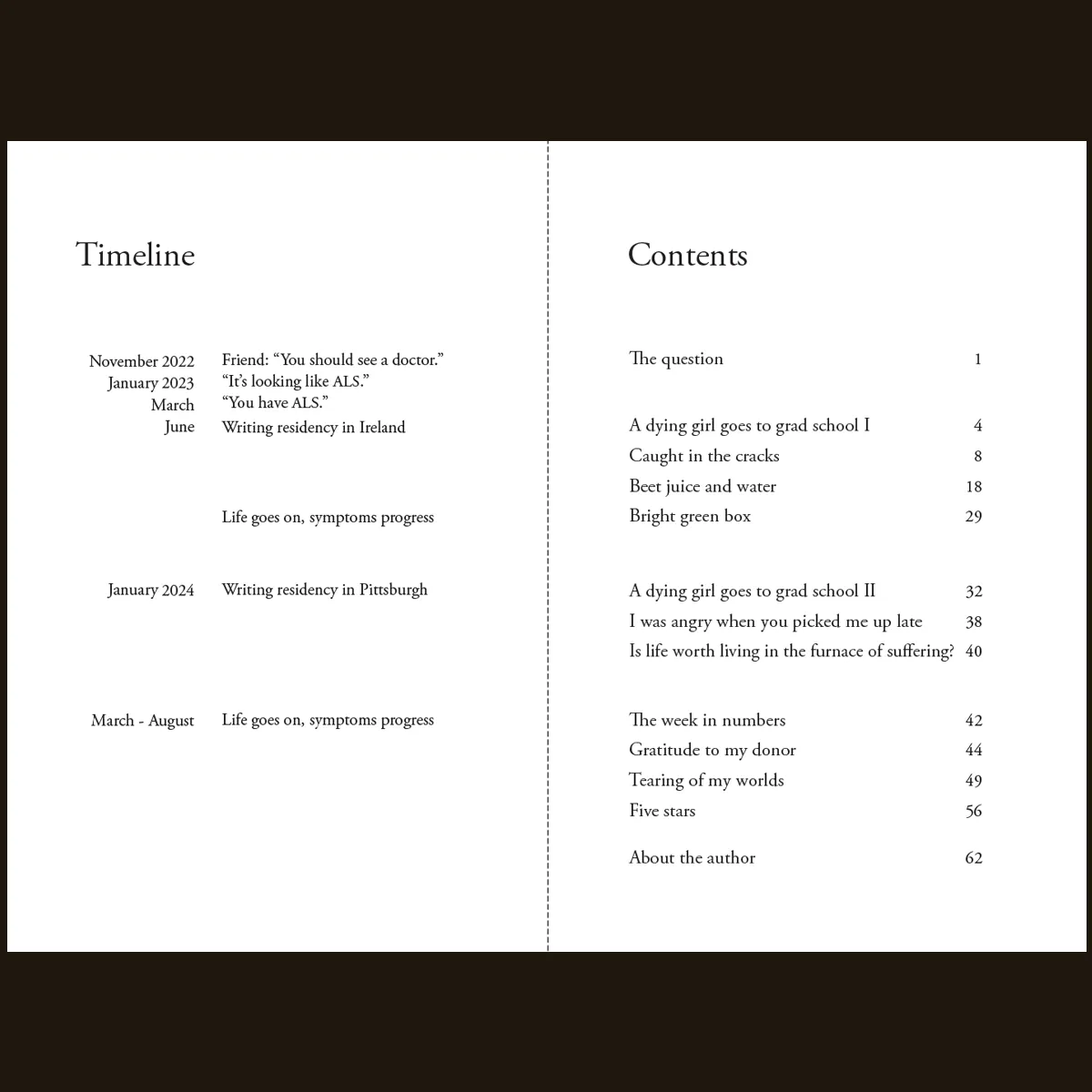 A vivid, heart-lifting and heart-breaking report from the teetering balance between devastation and joy. These short writings form a collage of Hanna du Plessis’ experience through two years of life after receiving a terminal diagnosis of ALS. Hanna gives us rare insight into the details of her experience with a progressive disease while also earning a graduate degree in creative writing and traveling the world. These short essays are laced with sharp detail, surprising humor, and observations about how to live and die. We all experience endings, fadings, losses and deaths. Hanna helps us find grace in the mundane and wonder in the wreckage. Hanna’s whimsical sketches make delightful companions to her vivid and often humorous language. It is rare to find these two things so well-forged together: an unflinching gaze into loss and an undaunted determination to fully experience life.