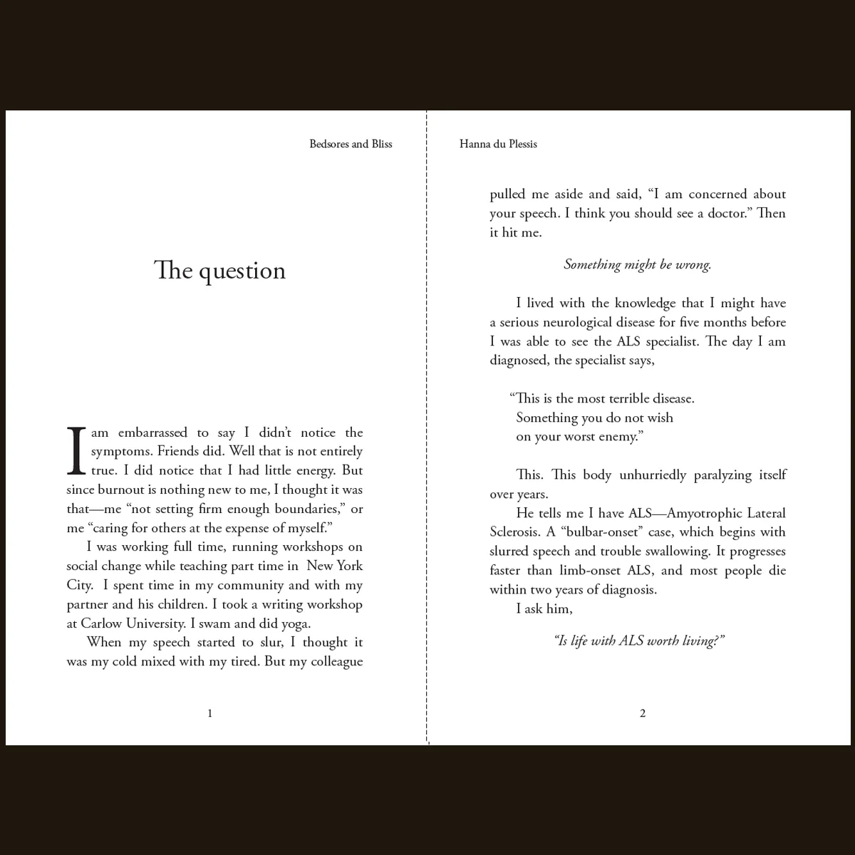Hanna’s creative practice combats the isolation and the confinement of ALS. In Bedsores and Bliss, Hanna explains this beautifully. She says the illness told her to end her career. But a donor’s gift gave her a new beginning—the ability to enroll in an MFA program, which provided the structure and support she needed. That first donation is what gave her permission to prioritize her creative practice. And her voice and work drew together a community of editors, fellow writers and artists, and a publisher who will steward her work into the world.